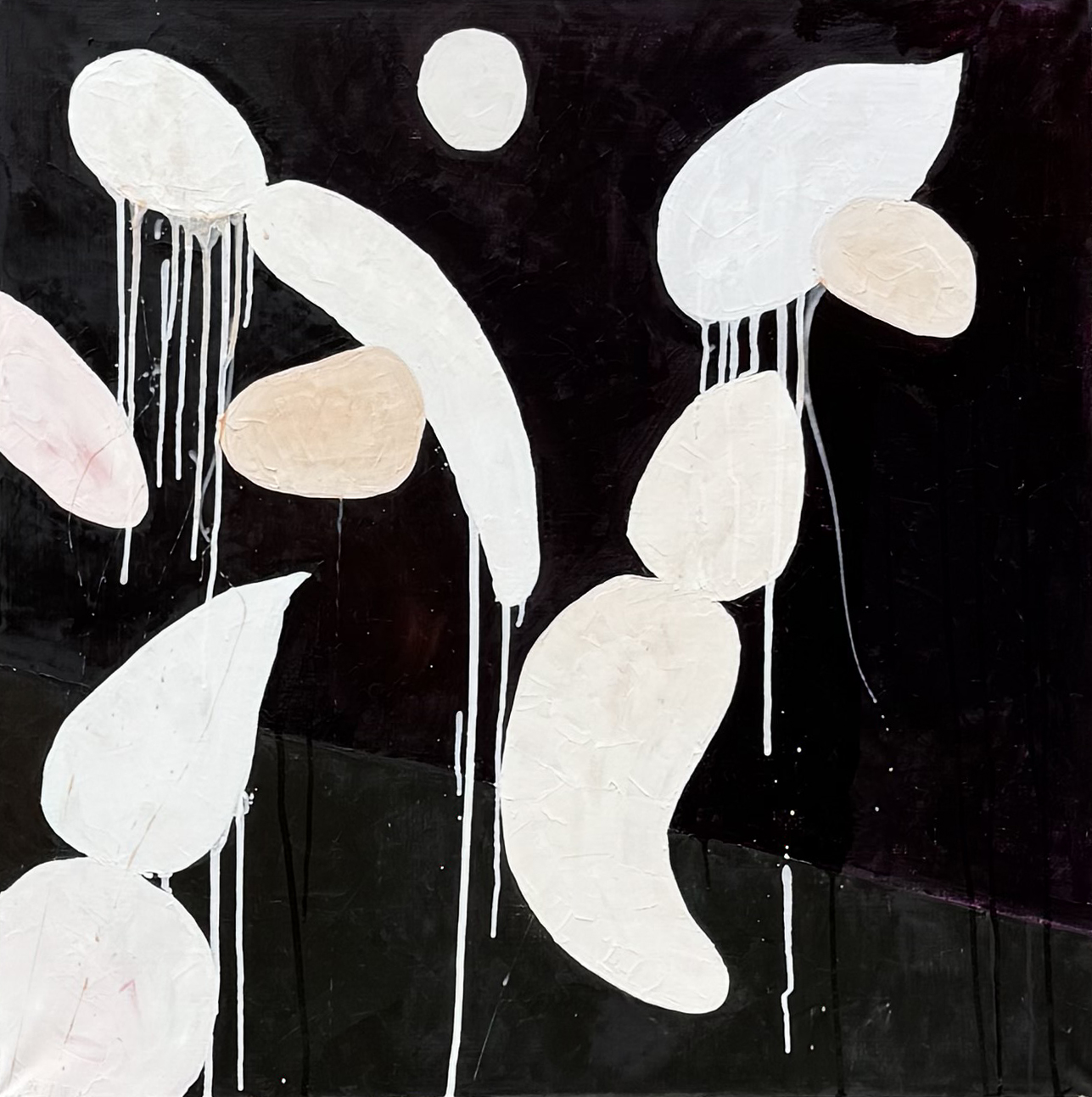 Биоморфные композиции на столе, словно намекают, что это были когда-то детали сервировки стола или продукты. Они перешли в новую стадию трансформации, вышли на новый уровень бытия. Где-то на данных натюрмортах можно разглядеть контуры существующей посуды, а где-то полностью затеряться в светлых пузырях. Тени не соответствуют реальности, а существуют сами по себе, они отделились от хозяев и текут по собственной траектории, словно растеклись чернила или молоко.